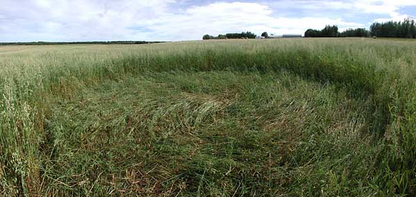 Drayton Valley crop formation, smaller circle. Diameter, 20 feet, counter-clockwise spiral lay. The buildings on the horizon are directly south of the formation.
