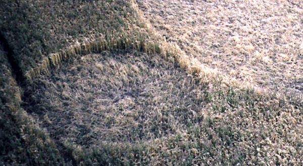 ![]() This is the east circle. Although the standing tufts are slightly swirled, the floor lay was predominantly radial. Notice what may be other circular patterns in the lay. These are not discernable from the ground. This photo, © R. Manuel, was shot from an 80 foot boom lift. |