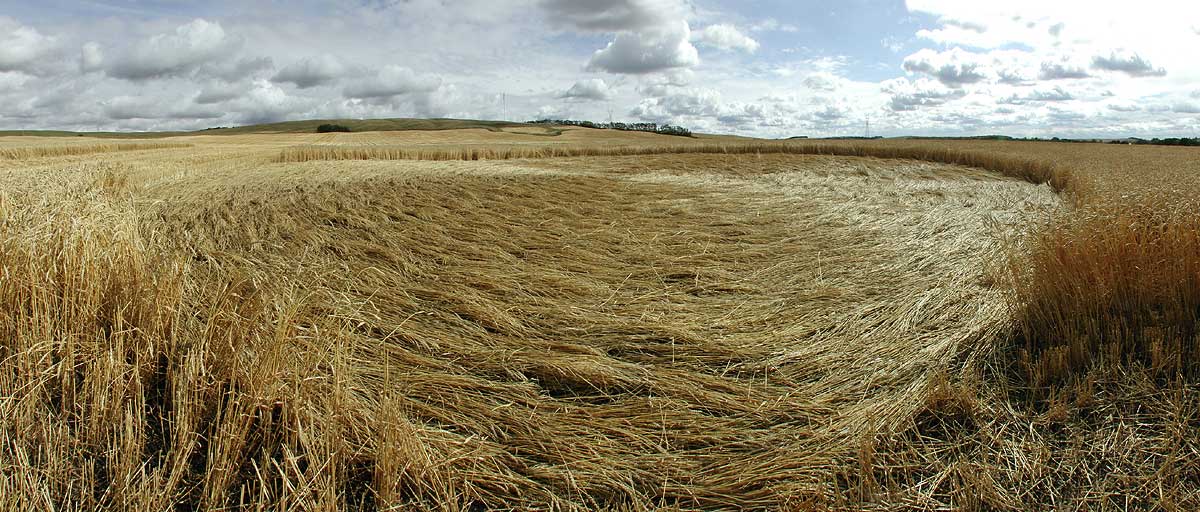 Center circle in the Red Deer crop formation. Large circle diameter is 106 ft ( 32.3 m). Please use your browser scrollbar to see entire panorama. PHOTOS © 2001 JUDY ARNDT