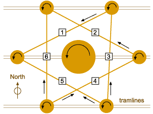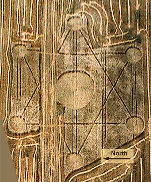 The six outer circles were connected by paths that formed a six-pointed star. Arrows show the direction that plants were laid. Total width of formation: 422 ft (128.6 m) Large circle diameter: 106
