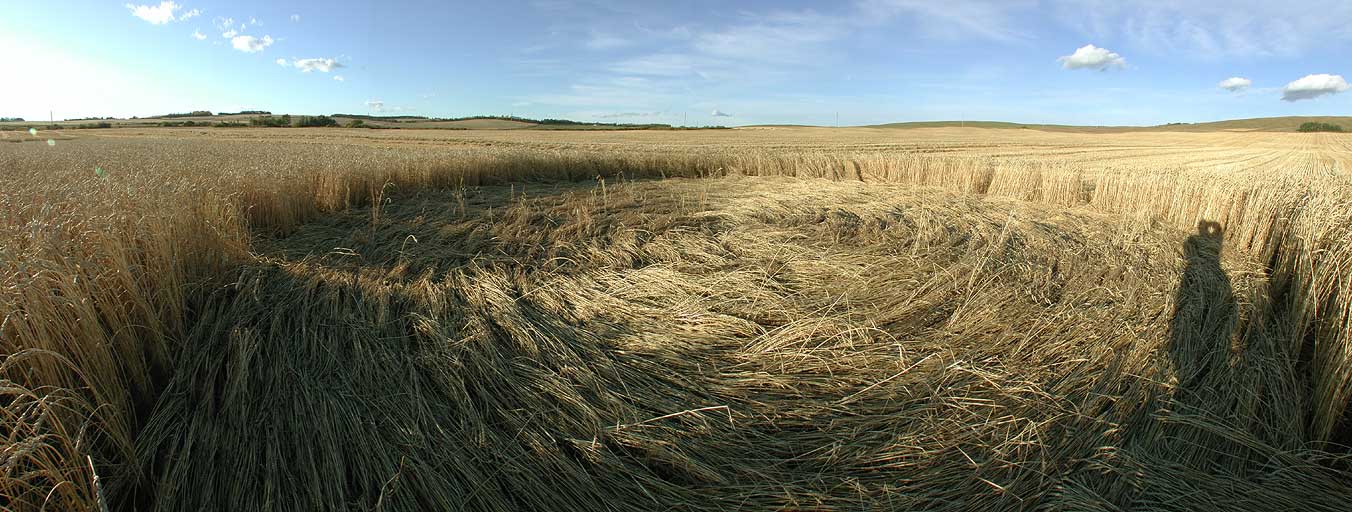 Northeast circle in the Red Deer crop formation. Circle diameter is about 44 feet (13.4 m). Please use your browser scrollbar to see entire panorama.