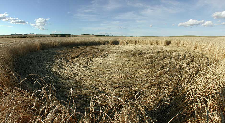 Southwest circle in the Red Deer crop formation. Circle diameter is about 44 feet (13.4 m). Please use your browser scrollbar to see entire panorama. PHOTOS © 2001 JUDY ARNDT